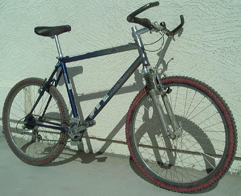 After beating up a Huffy for a few years, the Trek 6500 became my first legitimate mountain bike in the fall of 1995. I immediately began racking up the trail miles and learning the sport by trial and error. Given the location, a large majority of my riding is done at South Mountain Municipal Park in south Phoenix. Once my electric truck is complete and things have settled down a bit, I will consider abandoning this front-suspension bike for a newer and nicer two-wheeled, rock-jumping toy. This bike was originally purchased as a fully-rigid mountain bike for a sticker price of $600. As a high school student with no part-time job, that was a great deal of money at the time! But in 1995, this was also a relatively nice ride for $600. For the first 5 years, I rode the bike exactly as it was and didn't break or change a thing. Recently, I have been upgrading some components and conducting some "failure analysis" on other parts. Thanks to the generosity of my Aunt Beverly, I now have a donated Rock Shox Judy XC front suspension fork on the bike. I have also upgraded to clipless Time A.T.A.C. pedals... the greatest things since sliced bread! The bike was purchased with simple flat pedals and toe straps, which were then upgraded to Shimano 515 SPD clipless pedals after about 5 years. When a friend grew tired of his Time A.T.A.C. pedals, I tried them out and immediately fell in love with them. I gladly purchased them from him and sold my Shimanos to another riding buddy. After testing several different types of tires, I have finally settled with the Panaracer Fire XC Pro. A riding buddy had good experiences with them, so I purchased a set after going through a set of Tioga Factory XC tires in about two rides! The Panaracers have been really good for traction, yet have lasted forever! As my drivetrain began to wear out, I replaced several components. I replaced the chain and rear cassette with new versions of the same thing. I removed the old cranks and front chainrings and replaced them with new cranks and just a single chainring... a 32-tooth (middle) chainring. I now have a purpose-built 7-speed mountain bike! Thanks to a Christmas present from my riding buddies Chris and Allen, I also have an upgraded set of v-brakes to replace my original, old-school brake system! It's just amazing how technology has changed since my bike was built! Nicer components can now be had for just a fraction of the cost! My most recent upgrade was the changing of my cycle computer from a Trek Sensor (no longer manufactured) to a Planet Bike Protege 8.0. Despite popular opinion about Trek computers, my Trek Sensor worked amazingly well for me. I logged over 2,000 miles on the original battery, and was only recently beginning to have trouble with the buttons on the unit. My last crash was (unfortunately) enough to demolish the computer. But the Protege computer didn't stay on for very long. I took it off to check the calibration of my motorcycle's speedometer, then decided to leave it off my mountain bike for good. I think my riding has improved since ditching the computer. If you want a nice, 4-line LCD bike computer, I have one for sale!