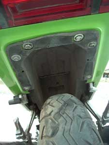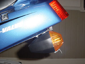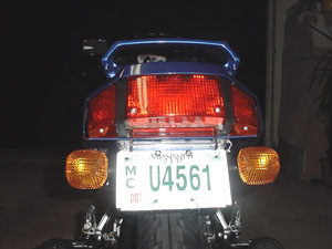 Lincense Plate Light: Once again, two primary options. Here, you can either decide to keep your stock license plate light or just remove it. I did away with my license plate light. Simply put, it isn't needed. The bike's tail light and the headlights of the car behind you do a fine job of lighting it up. In addition, you will notice that the bottom of your tail light lens has a rectangular section of non-transparent plastic. Removing this piece with a screwdriver will shine even more light on your license plate, given that your tail light is always on when your bike is running. To seal this opening up, many people have attached a clear piece of plastic to the inside of the tail light lens. A CD jewel case works well for this purpose. Your tail light lens is very simple to remove. There are only a few screws holding it in place. Remove the lens and it should be obvious what you need to do. If you still have questions, just ask.