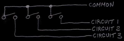 Electrically speaking, a 3-button garage door remote will look like this image, with one common "input" and three unique "outputs." Your choice of which button to push determines which circuit is closed, based on the switch located directly under that button.
