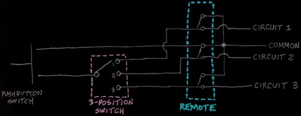 If you're having trouble understanding how this circuit works, here's a simplistic version of it. You have one "common" wire in your remote. In this case, I have a red wire soldered to this common. That red wire is spliced all the way up to your pushbutton. When you press the pushbutton, you complete the circuit to the other pushbutton wire, which then goes to the "common in" pin on your 3-position switch. Based on the location of the switch, it then selects which of the three circuits gets connected to this "common in" wire. The circuit is then completed from the switch back to the remote. You have in effect bypassed the actual buttons on the remote, but have not affected the remote's original operation in any way.